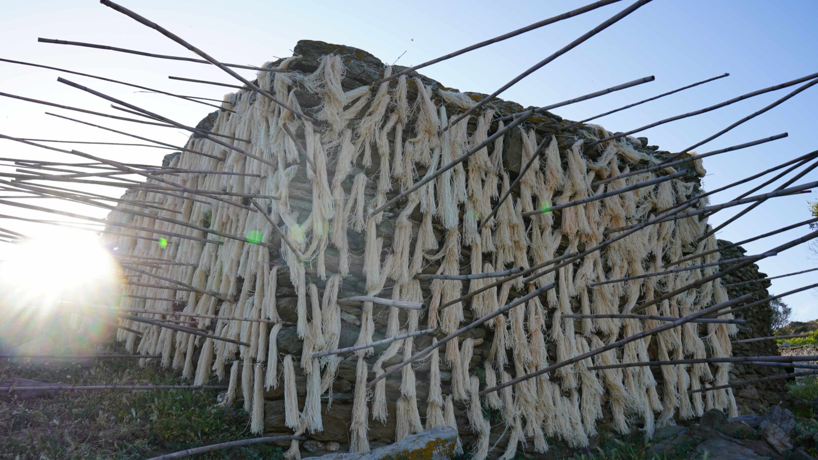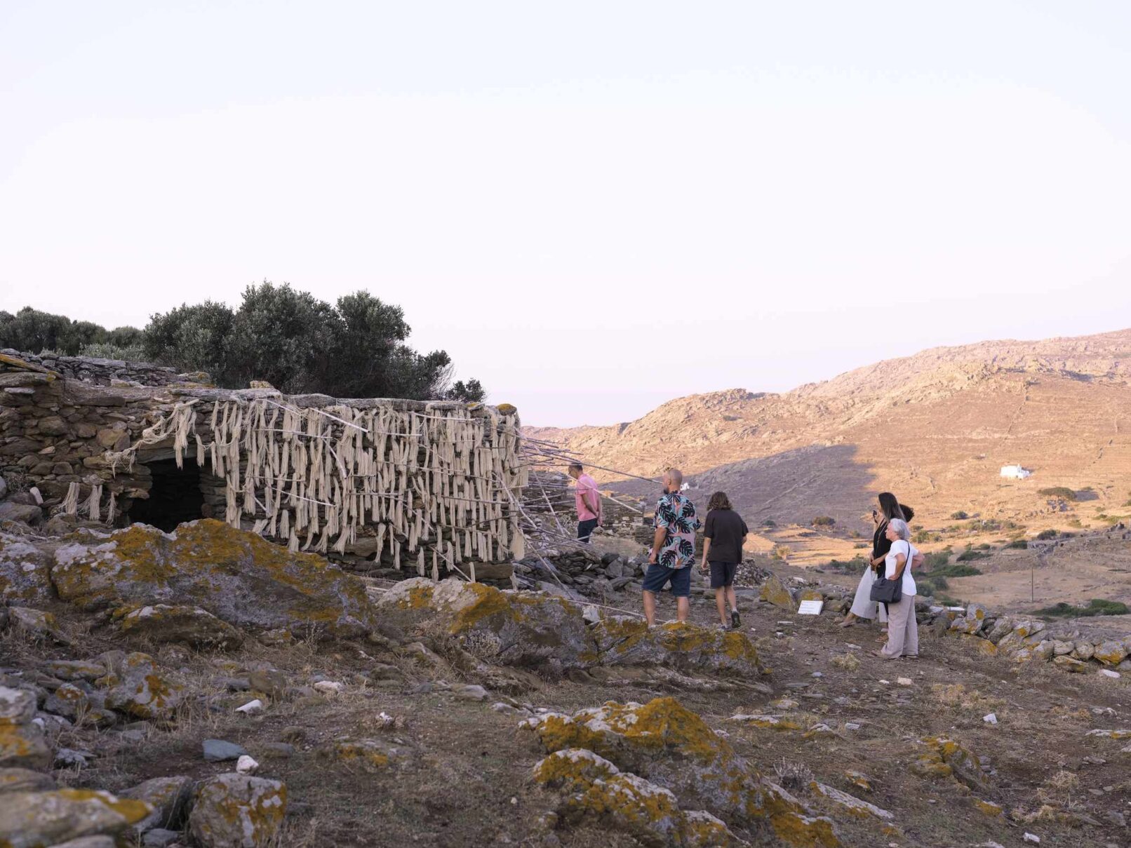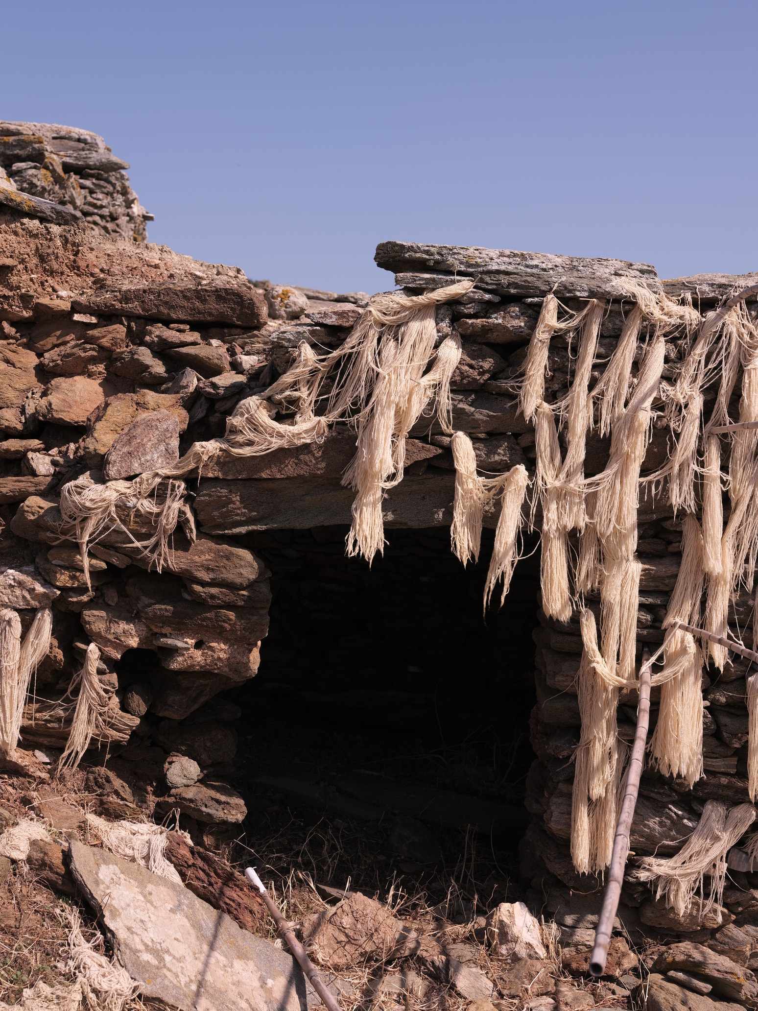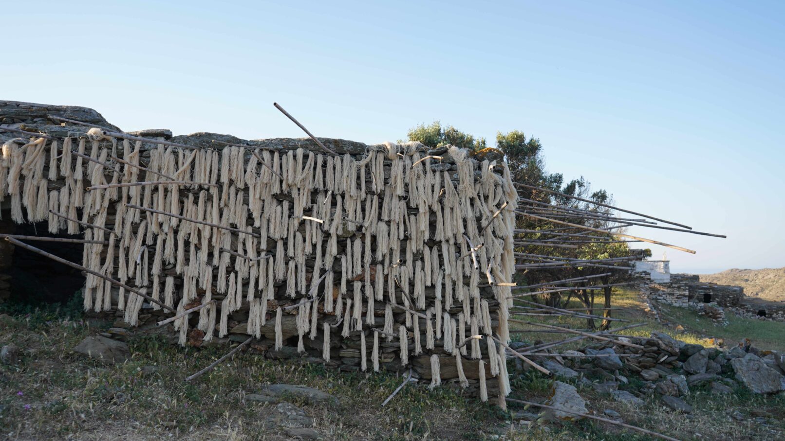 Α hybrid sculptural structure consisting of marble, stone, wood and thread, textures, and building methods used in the local structures will lead Maro to explore the traditional architecture and weaving art found on the island of Tinos. On the one hand, architecture is in line with the traditional consensus of the male architect (builder), and on the other hand, the female weaver takes over the interior (building) with textiles. A review of traditional art in terms of the practice itself brings to the surface relations between tangible practices, work, and gender.