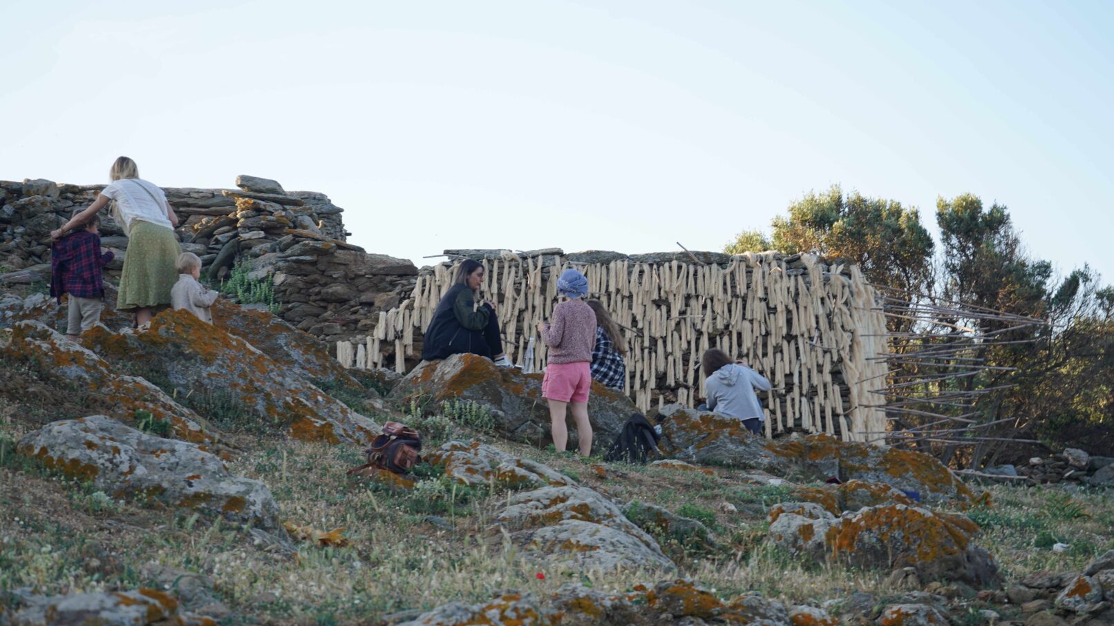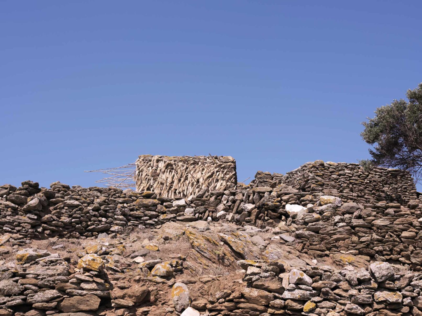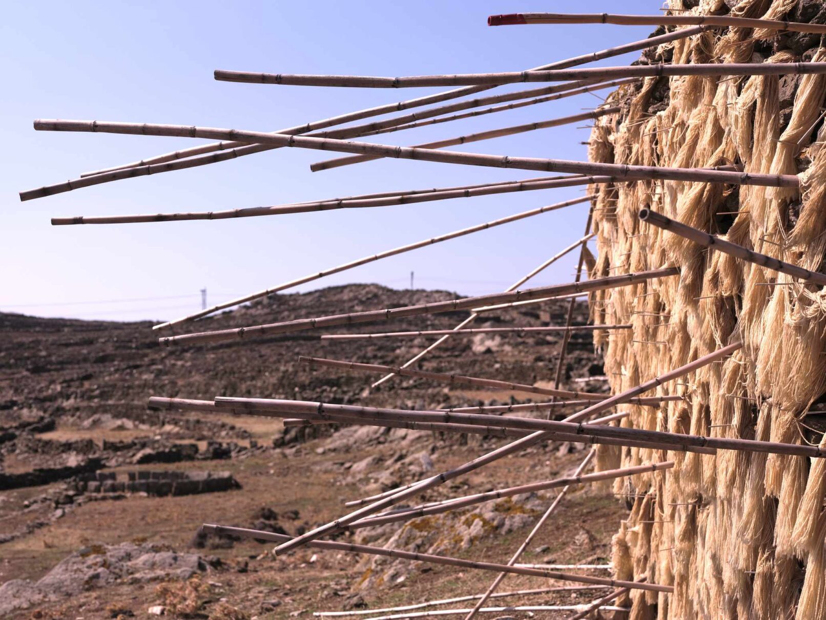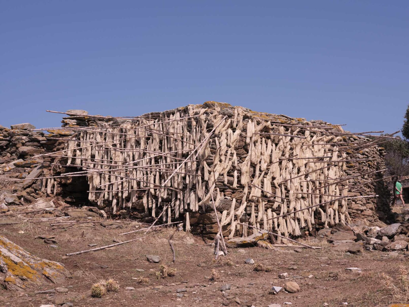 Α hybrid sculptural structure consisting of marble, stone, wood and thread, textures, and building methods used in the local structures will lead Maro to explore the traditional architecture and weaving art found on the island of Tinos. On the one hand, architecture is in line with the traditional consensus of the male architect (builder), and on the other hand, the female weaver takes over the interior (building) with textiles. A review of traditional art in terms of the practice itself brings to the surface relations between tangible practices, work, and gender.